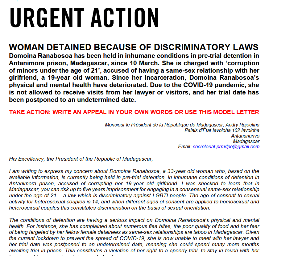Madagascar: Woman detained because of discriminatory laws criminalizing same-sex relationships with persons below 21 (instead of 14 for opposite sex relationships)