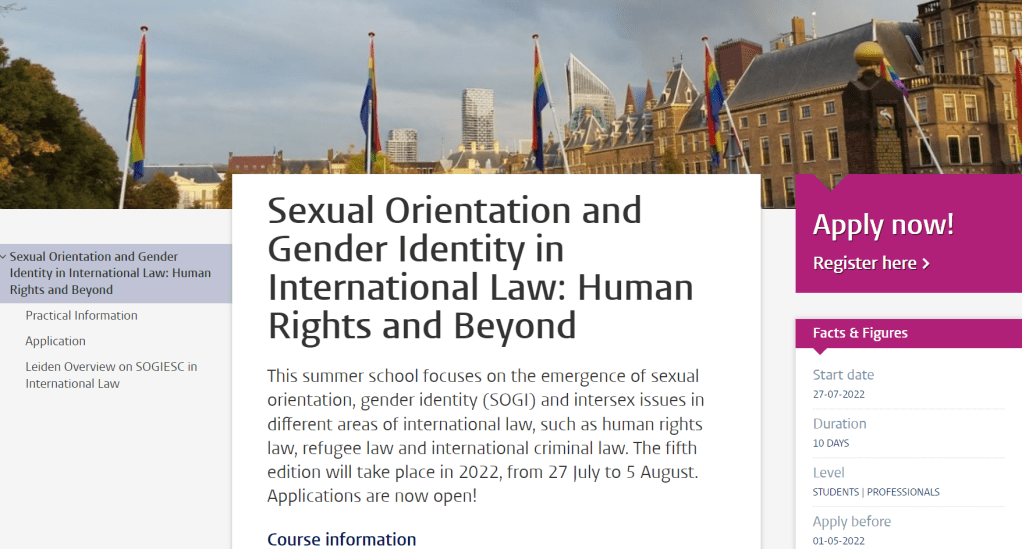 More information here: https://www.universiteitleiden.nl/en/education/study-programmes/summer-schools/sexual-orientation-and-gender-identity-in-international-law-human-rights-and-beyond