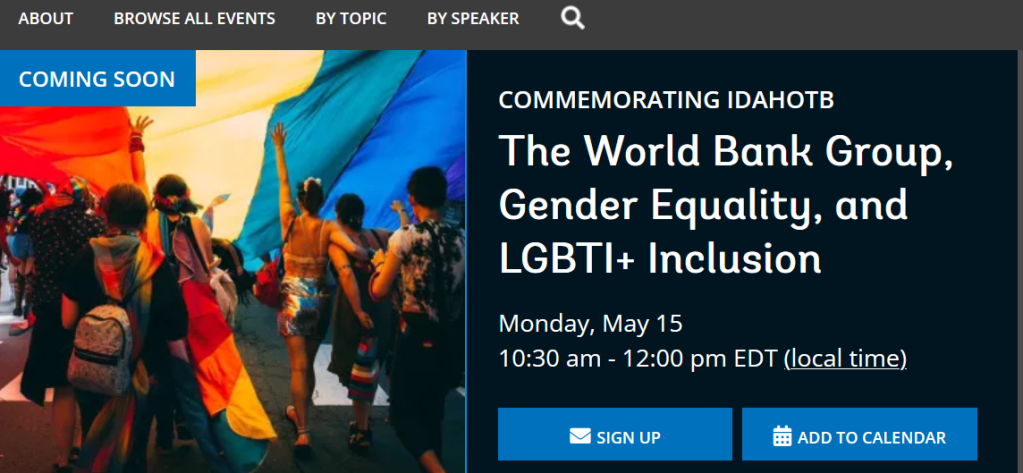 Join the World Bank for the launch of the Thematic Note on SOGI (Sexual Orientation and Gender Identity) Inclusion and to commemorate the International Day Against Homophobia, Transphobia, and Biphobia (IDAHOTB)