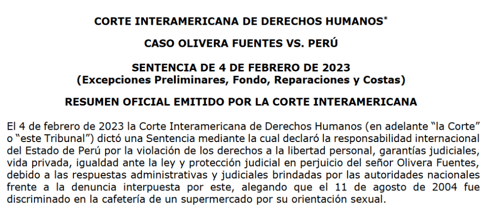 San José, Costa Rica, April 11, 2023.- In the Judgment notified today in the Case Olivera Fuentes v. Peru, the Inter-American Court of Human Rights found the State of Peru internationally responsible for the violation of the rights personal liberty, judicial guarantees, private life, equality before the law and judicial protection to the detriment of Mr. Olivera Fuentes, due to the administrative and judicial responses granted by the national authorities to the complaint filed by him, alleging that on August 2004, he was discriminated against in a supermarket cafeteria because of his sexual orientation.