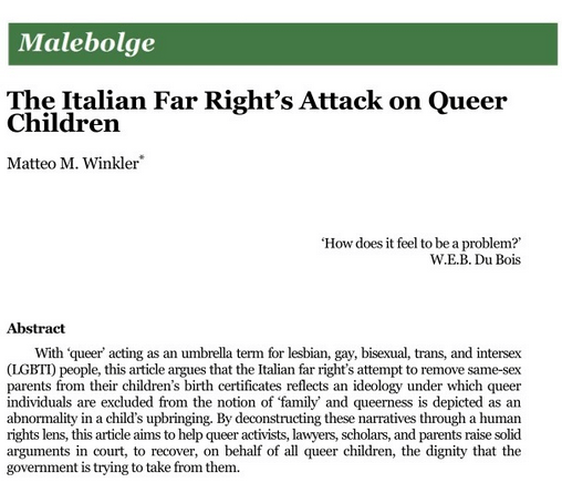 New Article: Matteo M. Winkler, The Italian Far Right’s Attack on Queer Children in: The Italian Law Journal, vol. 9, no.1, 2023, 117-137
