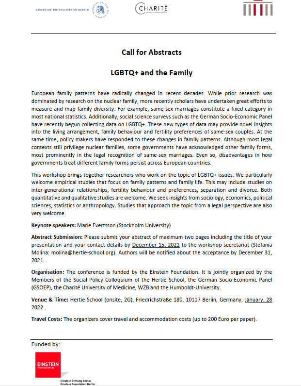 “Call for Abstracts – LGBTQ+ and the Family”, (on site conference in Berlin 28 January 2022, deadline for abstracts 15 December 2021)